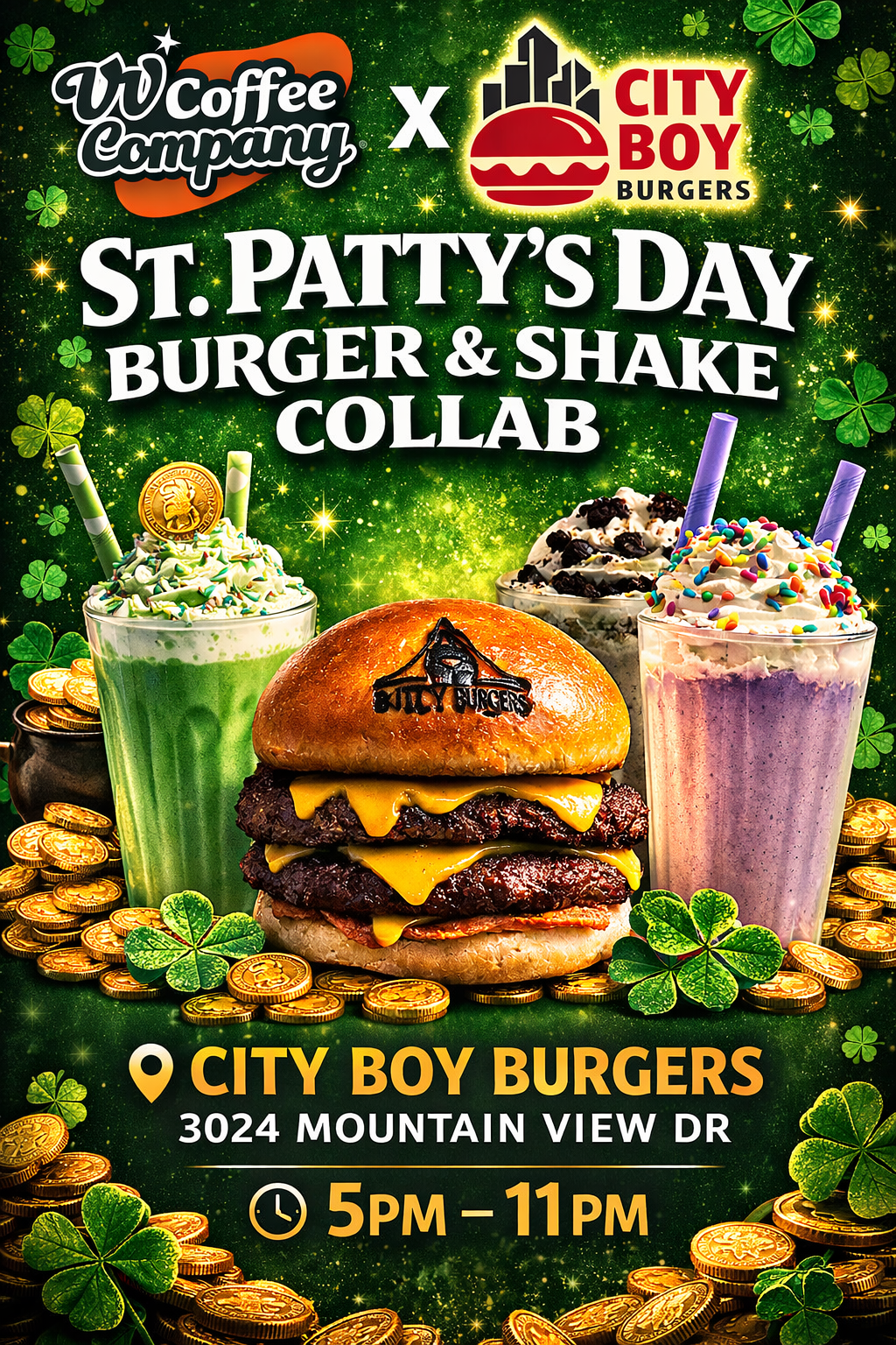 Date: March 17 Location: City Boy Burgers Address: 3024 Mountain View Dr Time: 5:00 PM – 11:00 PM