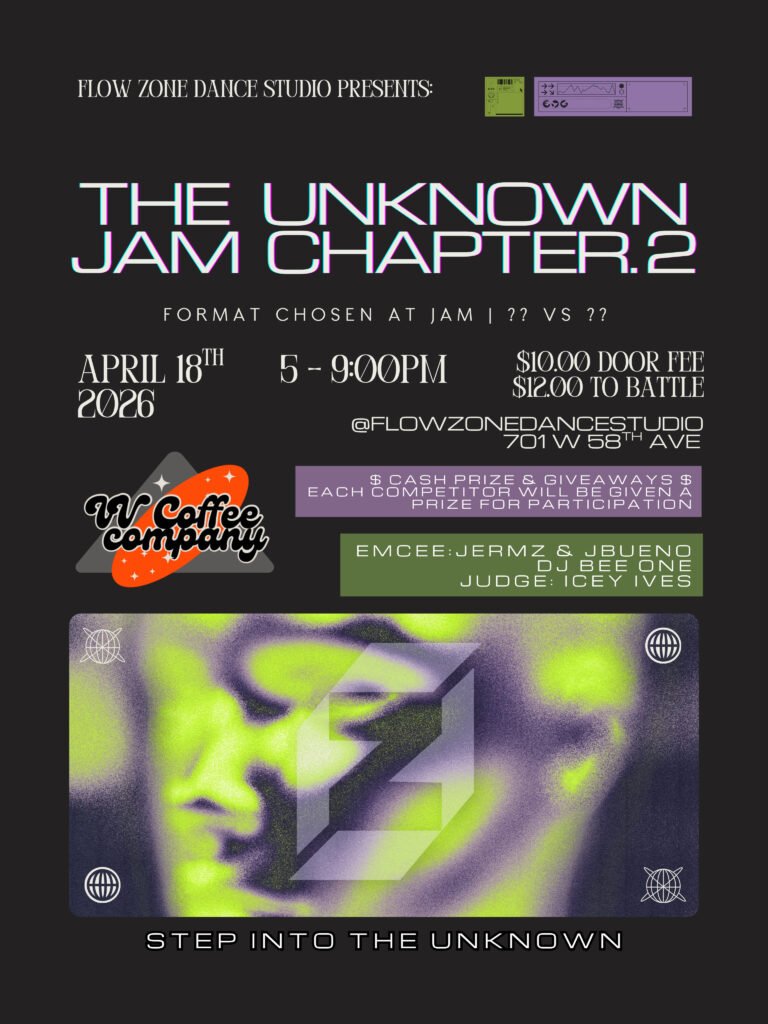 Join Flow Zone Dance Studio for The Unknown Jam: Chapter 2, a high-energy freestyle dance event where anything can happen. With battle formats revealed on the spot, this is your chance to showcase your creativity, adaptability, and raw style in an unpredictable and electrifying environment.