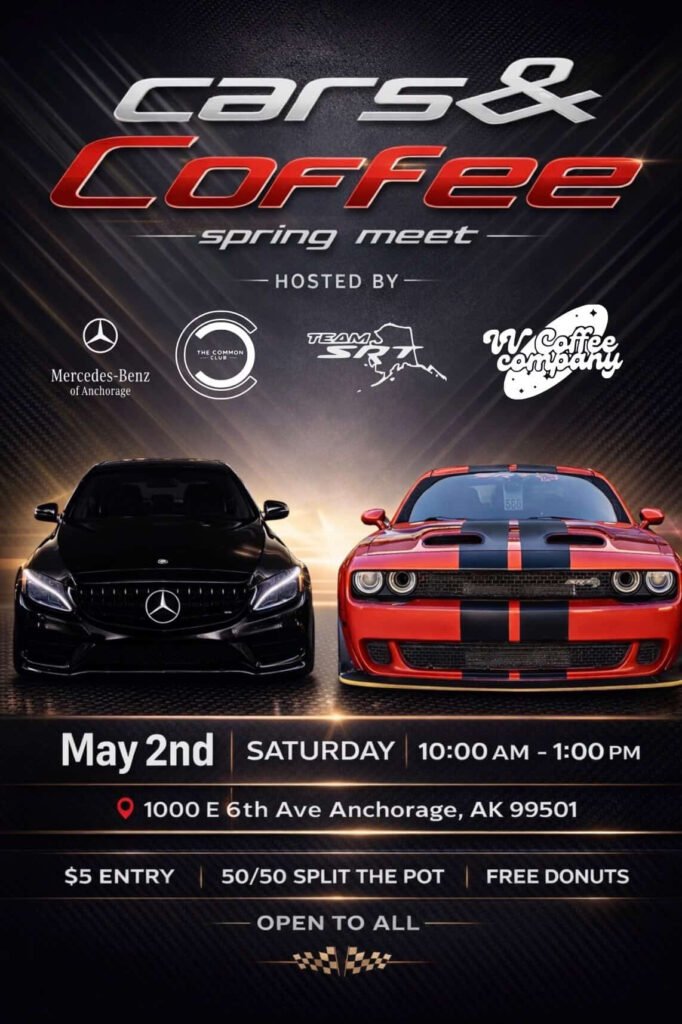 Join us for the Cars & Coffee Spring Meet, a community gathering for car enthusiasts, families, and anyone who enjoys great vehicles, good company, and a fun local event. Hosted in Anchorage with support from Mercedes-Benz of Anchorage, The Common Club, Team SRT Alaska, and VV Coffee Company, this meet is open to all.